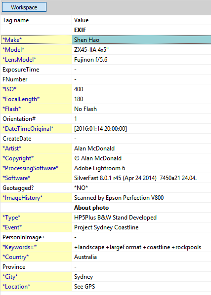 Once the scanning process has delivered a 200+Mb file, it’s time to implant EXIF information. If it’s done now, before importing into LR or PS etc, it will be there forever (so to speak) and continue on in any of the forms of output.